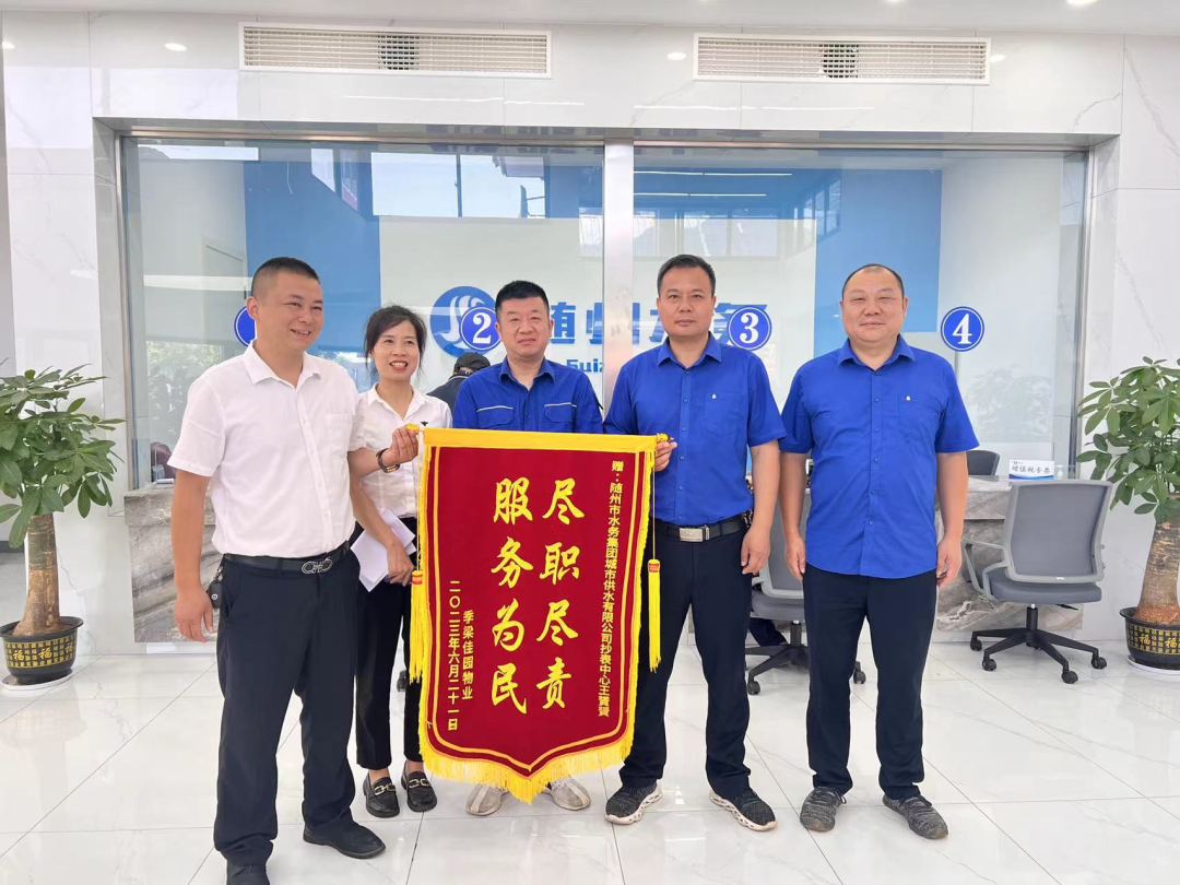 季梁佳園物業(yè)將一面錦旗送到城市供水公司工作人員手中,以表達(dá)對(duì)該公司供水服務(wù)的深深感激之情。錦旗上印著“盡職盡責(zé) 服務(wù)為民”八個(gè)大字,表達(dá)了物業(yè)和用戶對(duì)營(yíng)抄中心的王赟赟等工作人員提供的認(rèn)真高效、熱情周到的優(yōu)質(zhì)服務(wù)表示高度贊揚(yáng)和誠(chéng)摯的感謝!